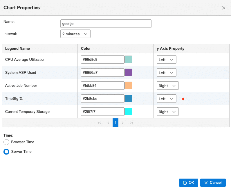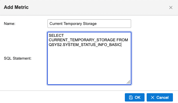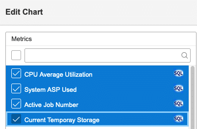 Over the years I have seen on many occasions temporary storage being the reason why disk space is filling up at an alarming rate, with an ad hoc SQL statement in an ODBC task being the cause. So it is good practice not only to monitor overall disk space usage, but temporary disk space as well. It is here where the new “Custom Chart” option comes into play. In this link IBM has already documented all the ground work IBM Navigator for i – Custom Charts. So I will limit myself to showing you the metric which I added for “Current Temporary Storage.