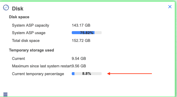 SELECT DEC( DECFLOAT(current_temporary_storage, 34) / (DECFLOAT(system_asp_used, 34)) / DECFLOAT(system_asp_storage, 34) * 10000, 3, 1) AS CURRENT_TEMPORARY_PERCENTAGE_USED, CURRENT TIMESTAMP AS CURRENT_TIMESTAMP FROM TABLE ( QSYS2.SYSTEM_STATUS(RESET_STATISTICS => ‘YES’, DETAILED_INFO => ‘ALL’) ) A