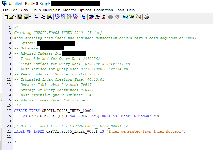 In most cases we simply press “Run All” button, maybe we decide to change the library or should I say collection in which the index is created, but that is about it. In this case I would like you to have a second look at the image and have a look at the sentence on line 3, which states: “When creating this index the database connection should have a sort sequence of *HEX.”.