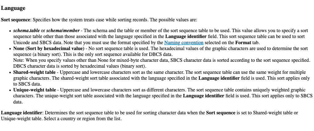 Now you may wonder, is this important and if *HEX is an option, are there more flavours. To answer this question, we need to have a look at the ODBC connection details. In order to do so, we select the option “Edit JDBC Configuration – default” from the Connection menu in the bar. When doing so, we select the tab “Language”. The default value for the “Sort sequence table” value is “None (Sort by Hexadecimal value)”. After using the pull down arrow, can select two other options: “Shared-weight table” and “Unique-weight table”. The blue question mark button in the bottom will help us filling in what they mean.