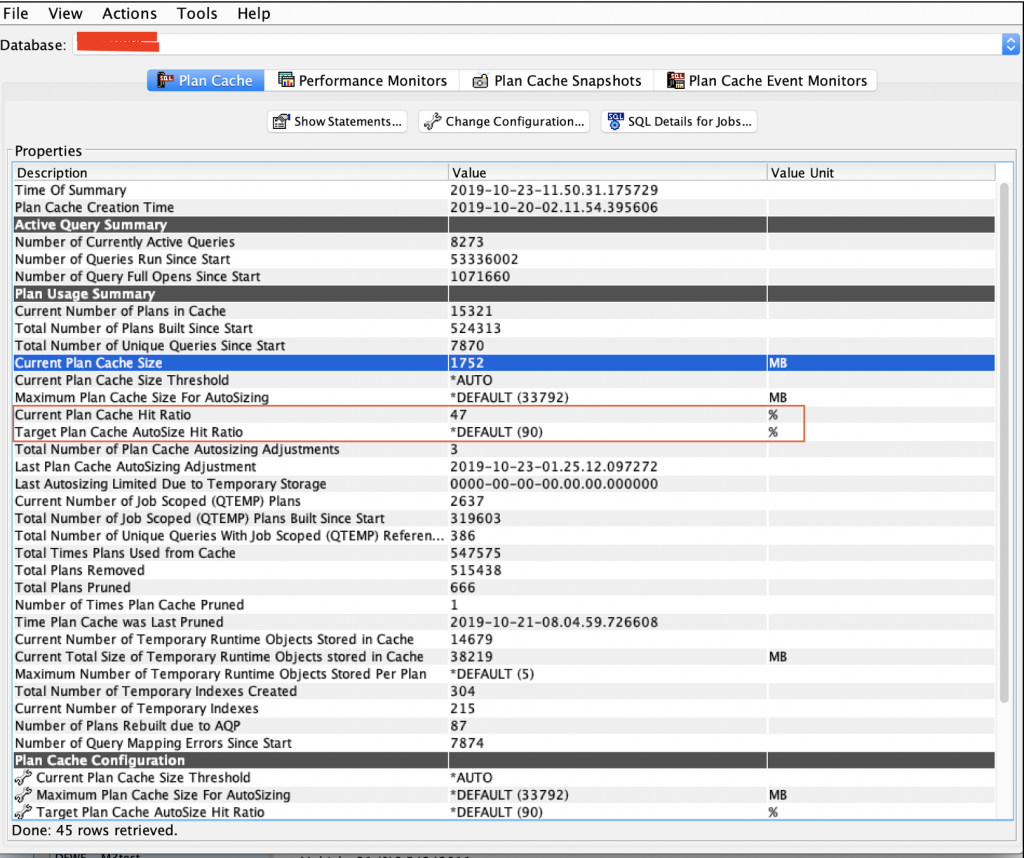 The question we can ask ourselves is why is the “Current Plan Cache Hit Ration: as low as 47 %, while the “Target Plan Cache Autosize Hit Ratio” is set to the default value of 90 %?