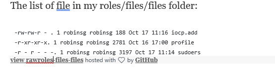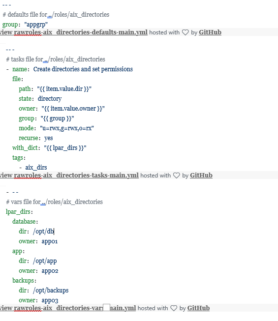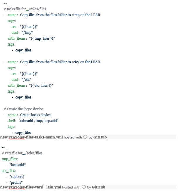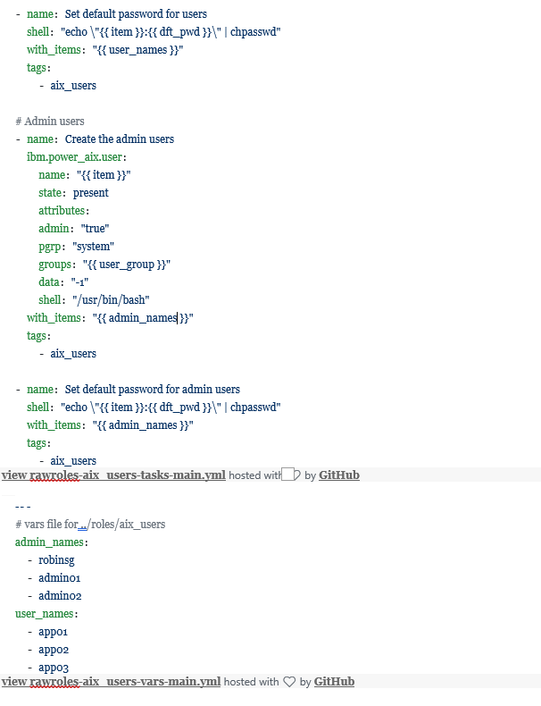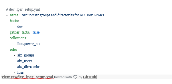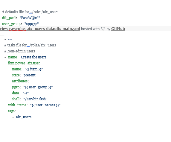 As you can see from the aix_user role above I got bored and piped a clear text password in to the chpasswd command. If you know Ansible at all you’ll be saying that I should have used Ansible vault to encrypt the password in the role. I know, and I would do this in a production environment.
