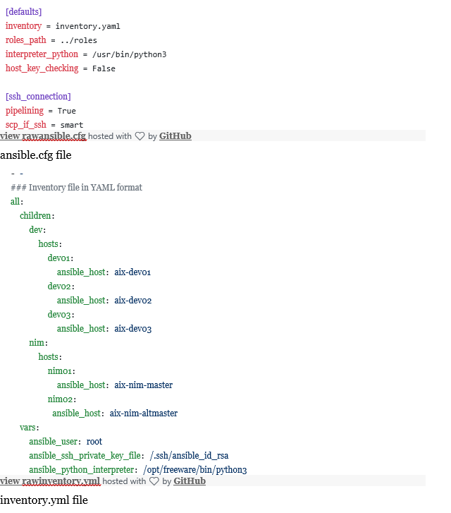 The following two snippets show the ansible.cfg file and the inventory.yml files in my project.