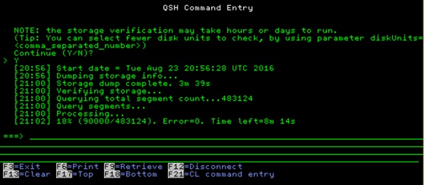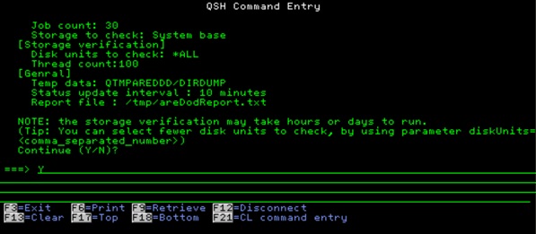 SBMJOB CMD(STRQSH CMD(‘/QIBM/ProdData/OS/OSGi/templates/bin/areVerify.sh -storage confirm=true diskUnits=*ALL’)) JOB(CHK4DAMAGE)