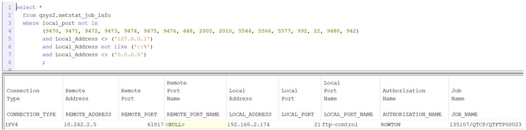 In this example I have created a simple piece of SQL that uses and IBM i Service to list all the encrypted ports on my system, so anything else must therefore be unencrypted.