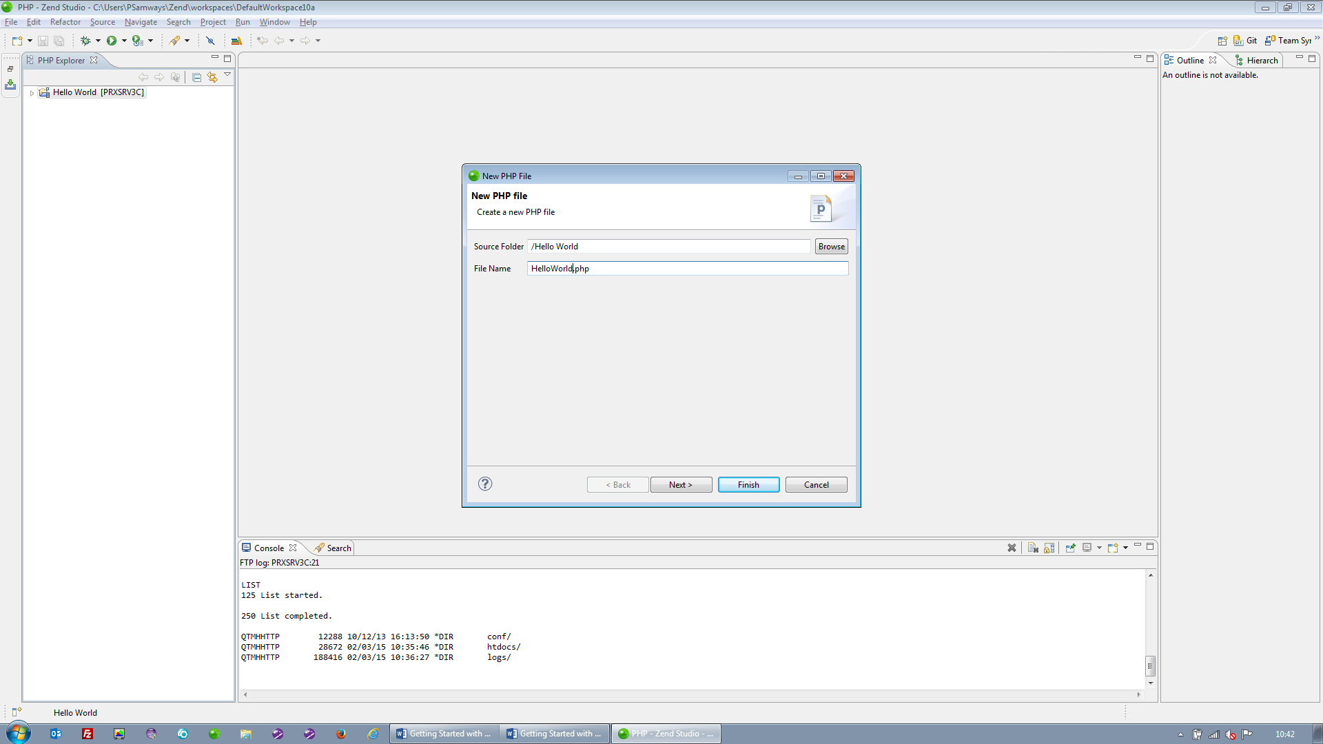 In the dialog box set the File Name to HelloWorld.php then click “Finish”.