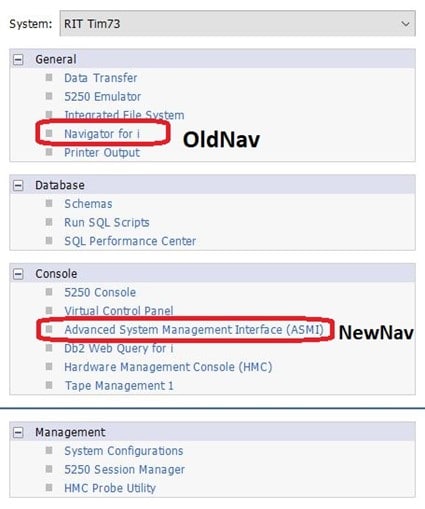 Once you are sure you have the correct PTFs installed to enable new Nav, then you should also check that you have the NewNav Webserver running on your system. It should start by default but just in case you can check for the ADMIN1 server by running: WRKACTJOB SBS(QHTTPSVR)