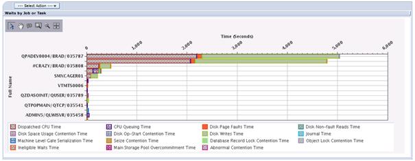 For each job on the system, in real time, I get to see exactly what makes up the response of the job. I can see how much time each job waits on processor, paging, disk, journaling, locks and more. So, in this case, I can quickly see that more than 50% of the job overall run time is based on waiting for the disk writes to complete.