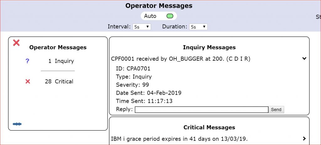 As it stands at the moment, this monitor is of limited use but it does tell you the number of messages waiting on QSYSOPR that need an answer. In the screen shot above there is one message that needs an answer and yes, you’ve guessed it, it’s for the program with the message wait.