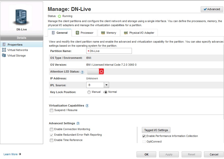 To most users, the main difference will be shown when they go to look at an existing LPAR. In the enhanced interface you will need to use the Manage option. Below is an example from a friendly client’s Power8 (thank you Annette).