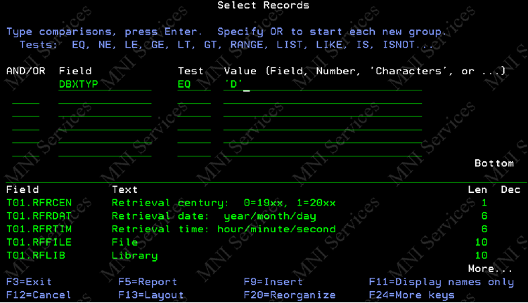 You can also include/exclude specific libraries, if you know for example that all the affected PFs/LFs are in MNISLIB, or none of them are! If you’re feeling adventurous you could take the output from this and join it back to itself (record format = record format, but one side = ‘P’ and the other side = ‘L’.) If you don’t want to have to go to the system table direct you could swap out qadbxref with another DSPFD this time on *MBR rather than *RCDFMT, MBDTAT is your friend there. As it happens the customer also runs that weekly as part of the re-org task so it was my first port of call, but then fancied going direct to the source instead.