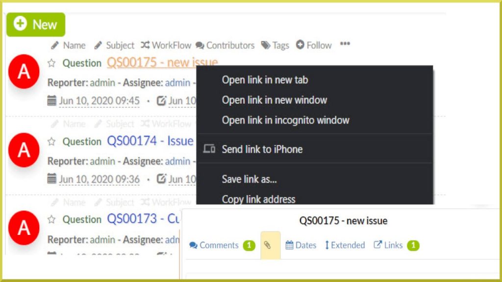 With the enhanced Gravity UI, easily see if there are attachments or comments associated with an item by the counter next to the heading. Another counter shows the number of links, enabling the user to clearly see if there are any links associated with the item and access them readily.
