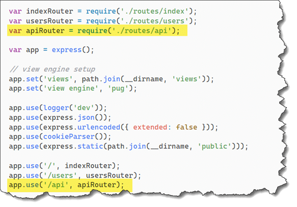 Next, we need to make this route reachable, so we add the API router details of the api.js to the app.js file.