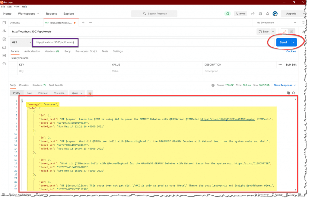 Fire up Postman and enter the URI of https://your IBMi:3003/tweets and hit the Send button.