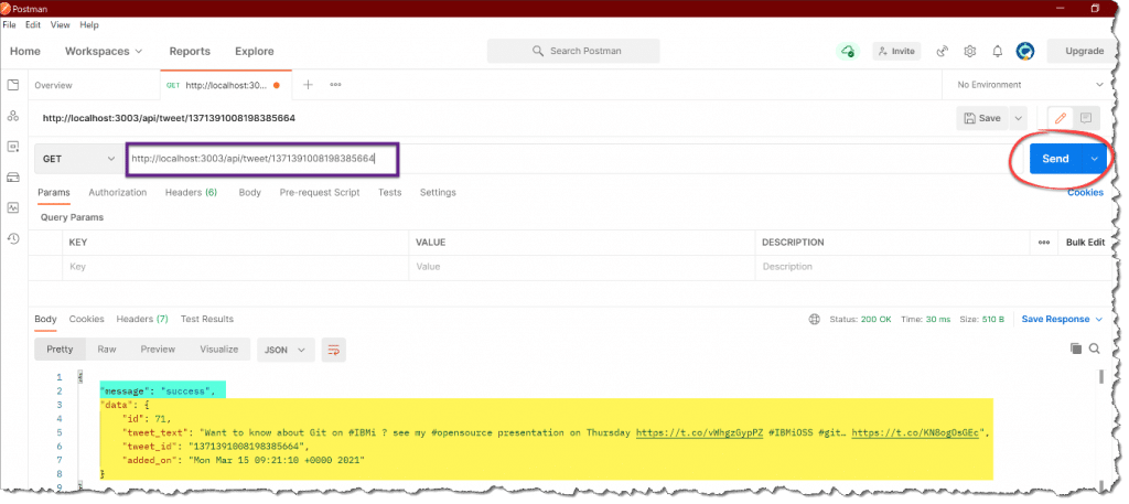 Very similar to the first test, except we pass in the id of the tweet we need, and the endpoint is called tweet.