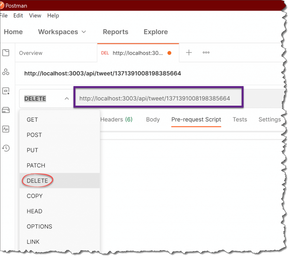 And finally, let me use Postman to check if the delete endpoint is working. In Postman, this time we change the HTTP method dropdown to Delete and the URI to https://your_IBMi:3003/api/tweet/1371391008198385664