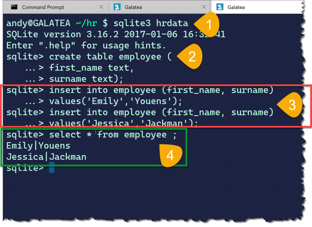 .quit | Exit SQLite command processing (You can also use Ctrl-C) |