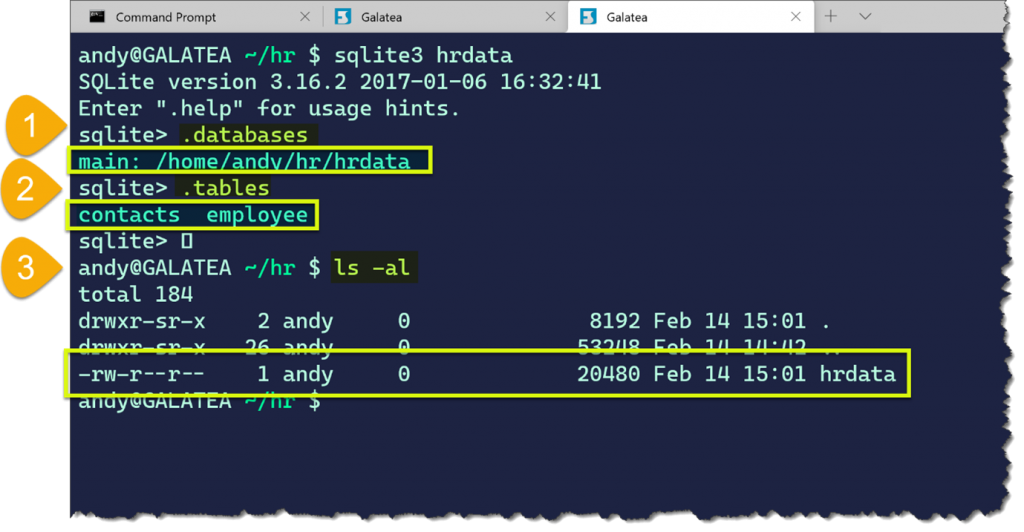 While you are in the SQLITE3 command line, there are numerous commands you can input to show you information about your database. These commands all start with the full stop character.