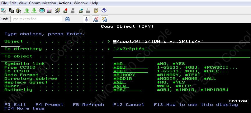 Use CPY OBJ(‘/qopt/PTFS/IBM i v7.2Ptfs/*’) TODIR(‘/v7r2ptfs’) to copy the files from Flash Drive to local directory