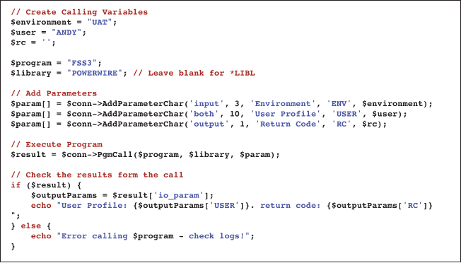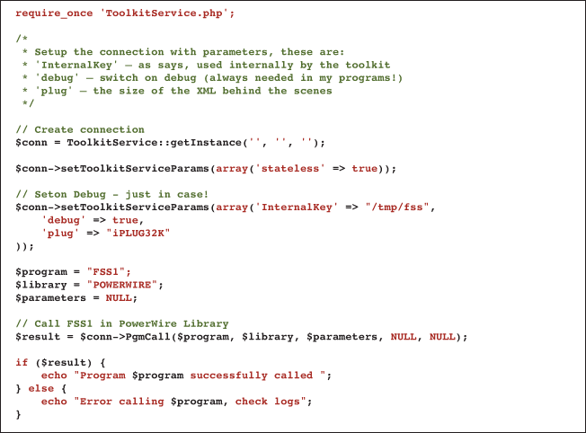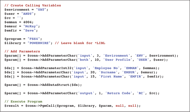 Next we use the PgmCall method, passing the name of the program, the library it resides in, and thirdly, the parameter variable, which is null as we are not passing any variables into the program POWERWIRE/FSS1. We could have omitted the last three parameters on our call as these are optional.