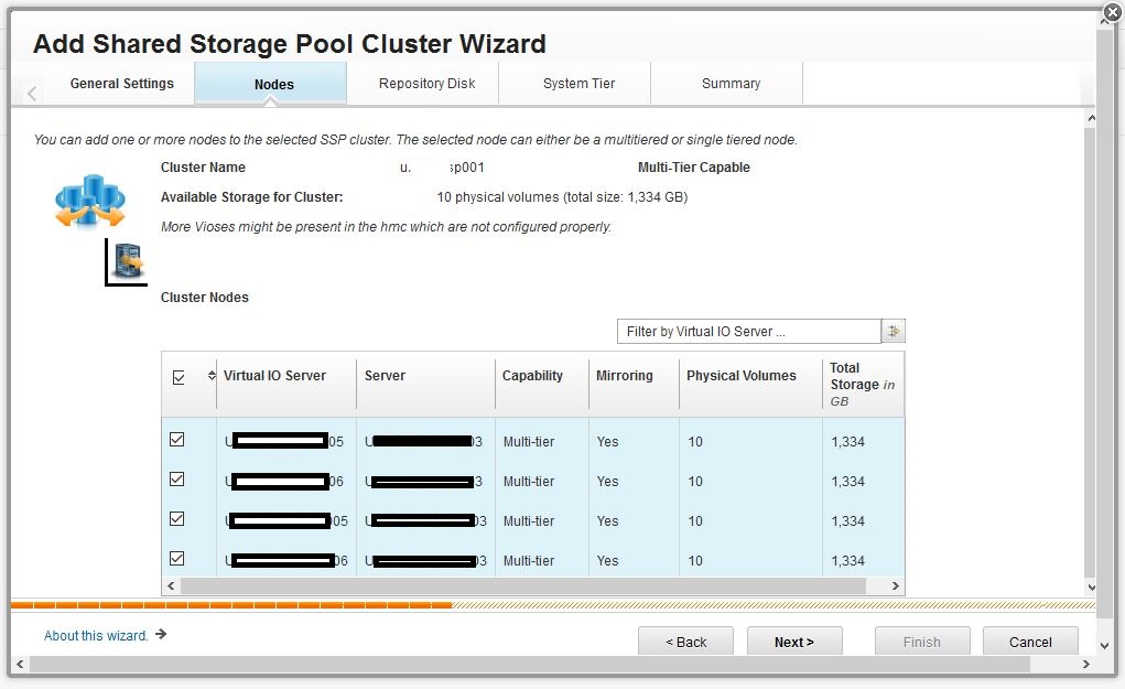 The wizard will display volumes (hdisks in VIOS) which are available to the SSP but currently unassigned to any SSP tiers.