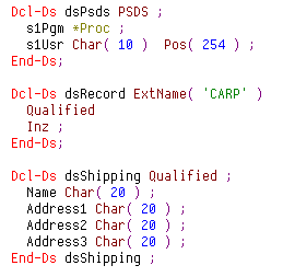 In the first example, we have declared a data structure picking up the program system data structure, called dsPsds, which contains two subfields, s1Pgm and s1Usr. The second one is a fully qualified data structure that uses the file layout of our car file CARP to define the data structure. The third example is a typical data structure being utilised for address details.