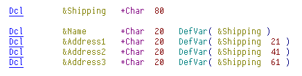 An example of using this functionality in CL is shown in the figure below. It is the equivalent coding to the RPG in the third example above. In CL programming, the DefVar keyword is utilised to make a subset of the shipping address, as shown in the example below.