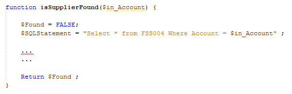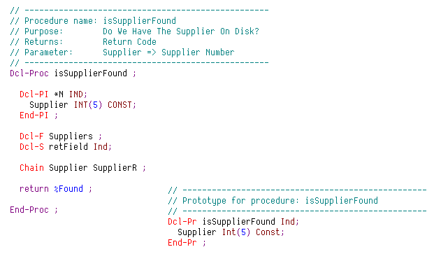 An example of the prototype, which is started with Dcl-Pr and ended with End-Pr, is additionally shown. Therefore, this prototype has the supplier number, defined as an integer, with a length of 10 being passed to the procedure “isSupplierFound”, which returns an indicator on whether the supplier record is located.