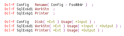 As I am sure you know, to do any file handling in RPG we need an F-spec. An example is shown below.