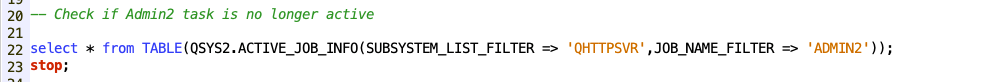 Stopping and starting the heritage Navigator for i ADMIN2 task can take some time, so again a quick check to see if the task stopped, using the Db2 for i Service => QSYS2.ACTIVE_JOB_INFO().