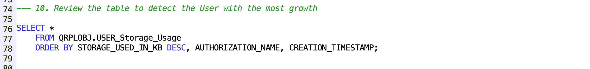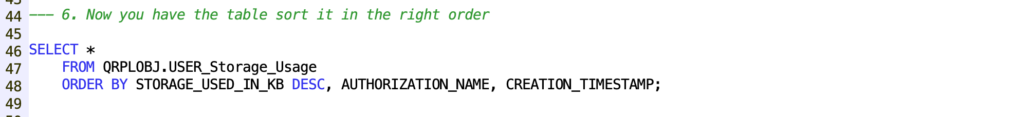 If the numbers of storage used are for different users very close, it might be better to oder first by “AUTHORIZATION_NAME” followed by “STORAGE_USED_IN_KB”.