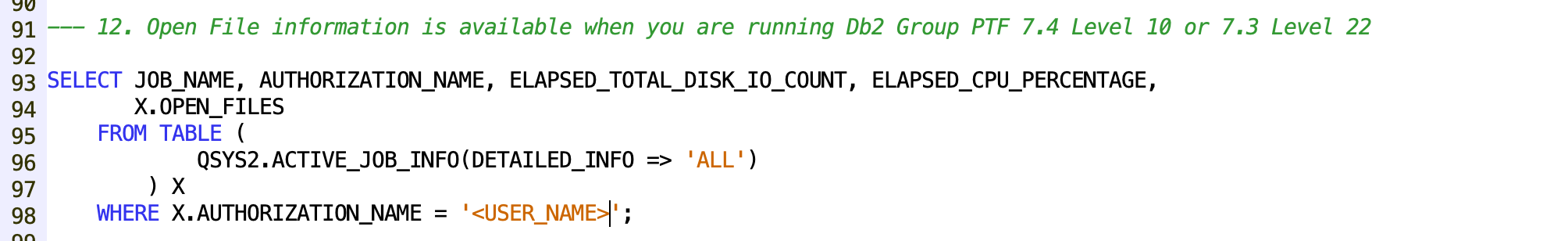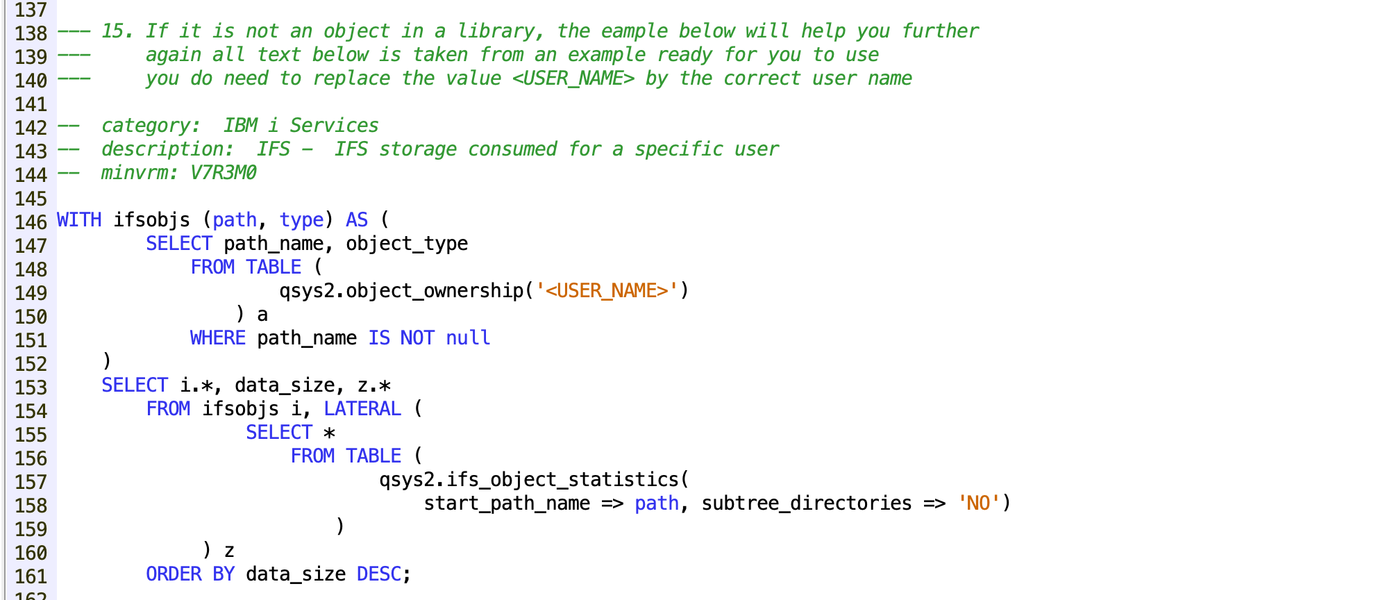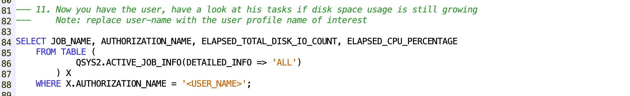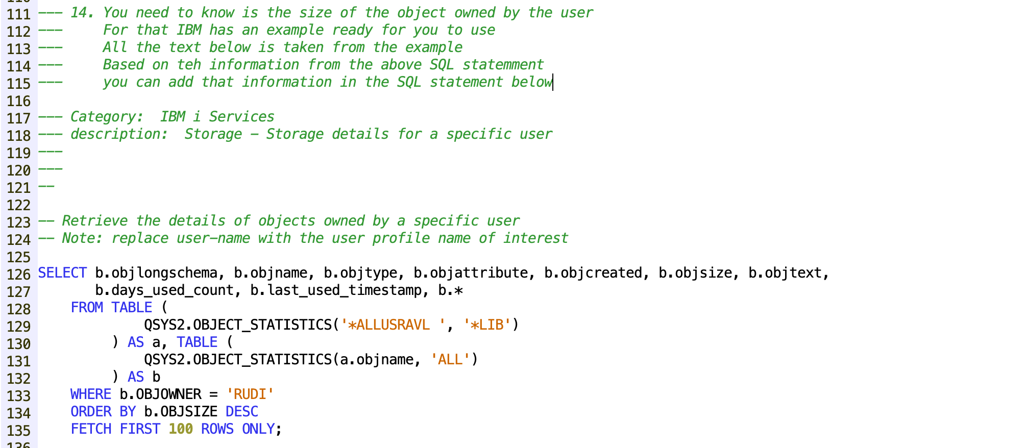 The last few year more and more of my tasks have moved from 5250 emulation to Run SQL scripts. So finding the reason why disk space suddenly spikes is no exception. Using some of the given examples, tailoring them a bit and adding a bit myself, enables me not only to learn better SQL, but also to get results faster. So I use the button “Save as New Example…” a lot and have added a Category of my own to keep my examples apart from the IBM examples. Th SQL script I want to talk about is the one I use when disk space spikes all of a sudden. Although the script I am using can be more automated, up to now I have only used it interactively, so let me get into the details of the script