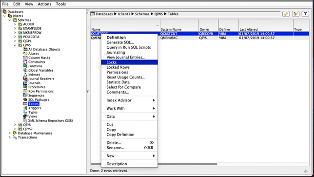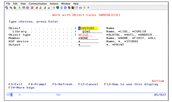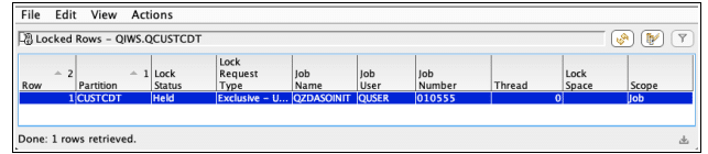 As an example, I ran the SQL statement: “select * from qiws.qcustcdt”, this caused a lock. I could use the WRKOBJLCK command but I think my new habit is a good one so as an alternative, you can use: