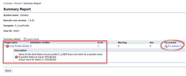 On our other server, we can see that the F_User profile is *Disabled. ARE can also change the profile to *Enabled by hitting the Fix action button.