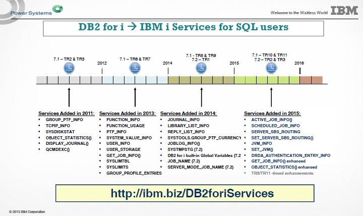 There are literally dozens of these IBM i Services starting in v7.1, with more being added by PTF with every TR level. Below is a table provided by Scott Forstie at the i-UG meeting which summarises these services and when they were added.