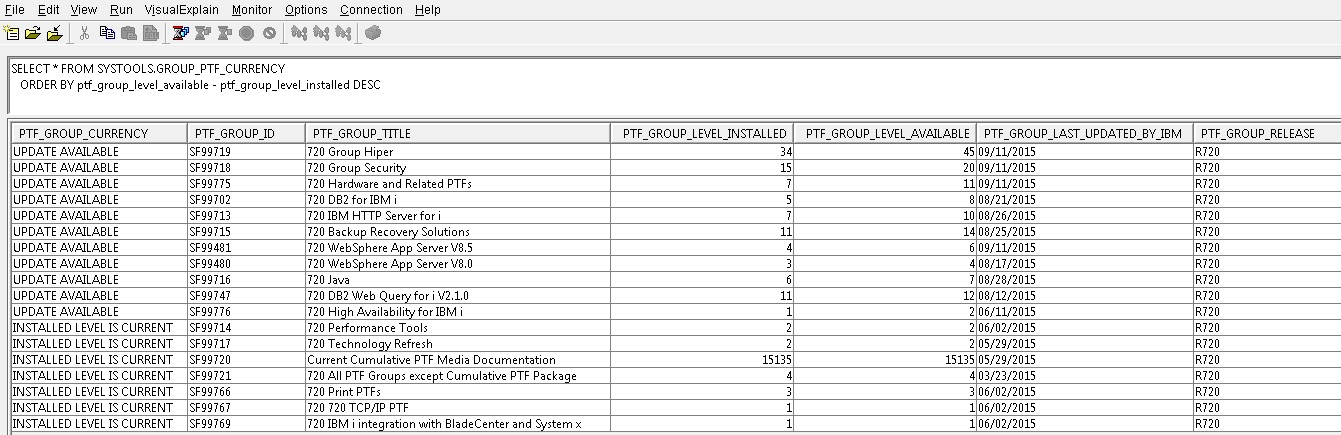 SELECT * FROM SYSTOOLS.GROUP_PTF_CURRENCY ORDER BY ptf_group_level_available - ptf_group_level_installed DESC