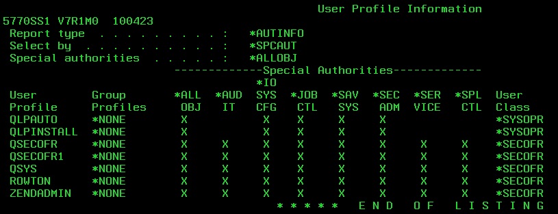 This user inherits its *ALLOBJ super powers from its Group Profile ROWTON. It does not have *ALLOBJ specified in its own parameter and so does not show up on the PRTUSRPRF list below. However, that does not stop this user from having full access to every object on the system.