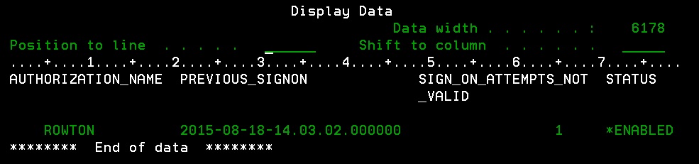 Well, think again. There is a good reason why this SQL statement is longer; it is because it gives you a more complete answer. You will notice that user SURPRISE is in the list above from IBM i Services but not in the list below from PRTUSRPRF.