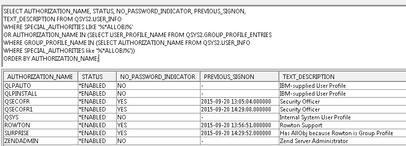 SELECT AUTHORIZATION_NAME, STATUS, NO_PASSWORD_INDICATOR, PREVIOUS_SIGNON, TEXT_DESCRIPTION FROM QSYS2.USER_INFO WHERE SPECIAL_AUTHORITIES LIKE '%*ALLOBJ%' OR AUTHORIZATION_NAME IN (SELECT USER_PROFILE_NAME FROM QSYS2.GROUP_PROFILE_ENTRIES WHERE GROUP_PROFILE_NAME IN (SELECT AUTHORIZATION_NAME FROM QSYS2.USER_INFO WHERE SPECIAL_AUTHORITIES like '%*ALLOBJ%')) ORDER BY AUTHORIZATION_NAME;