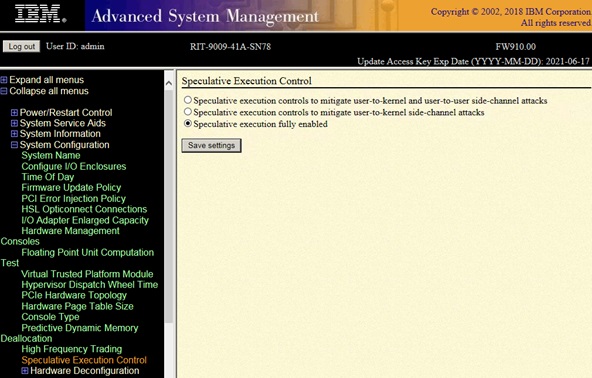 Open the ASMI (Advanced System Management Interface), login in as the admin user and navigate to > System Configuration > Speculative Execution Control.