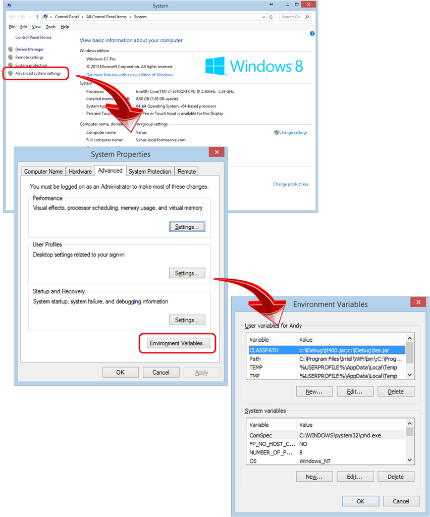 This is achieved by navigating into control panel, then selecting System (the Windows key and Pause being an excellent shortcut), then Advanced system settings; Environment Variables. This can be seen in the figure below.
