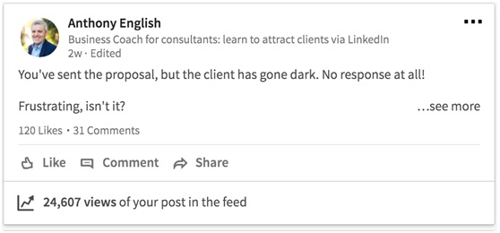 I wrote a short post about what to do when you send a proposal and don’t hear back from the client. That post was viewed over 24,000 times, had 120 likes and 31 comments.