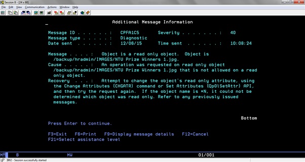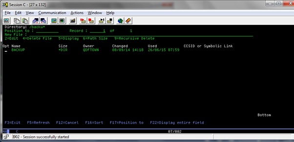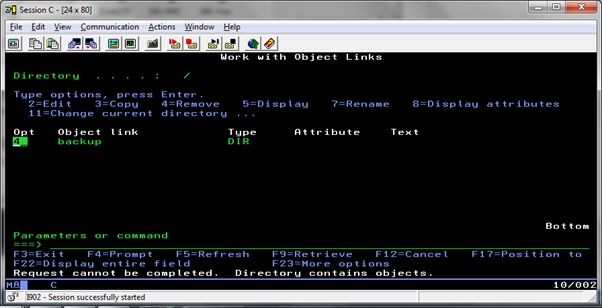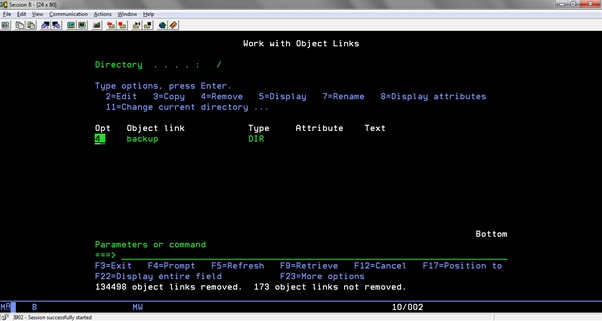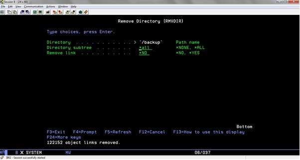 RMVDIR DIR('/backup') SUBTREE(*ALL)BashNow, for those of you who think I’ve gone potty or perhaps just made a mistake by leaving that first RMVDIR command there, bear with me. I know the RMVDIR is going to (or at least likely to) fail but this extra command can still save you time.