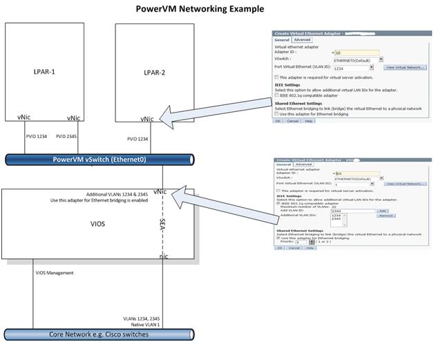 Whether you have one or more VIOS VNICs, you can then bridge these to the physical LAN adapter(s) assigned to the VIOS virtual server. This is called a Shared Ethernet Adapter (SEA) as it allows multiple VNICs to share the same physical adapter.