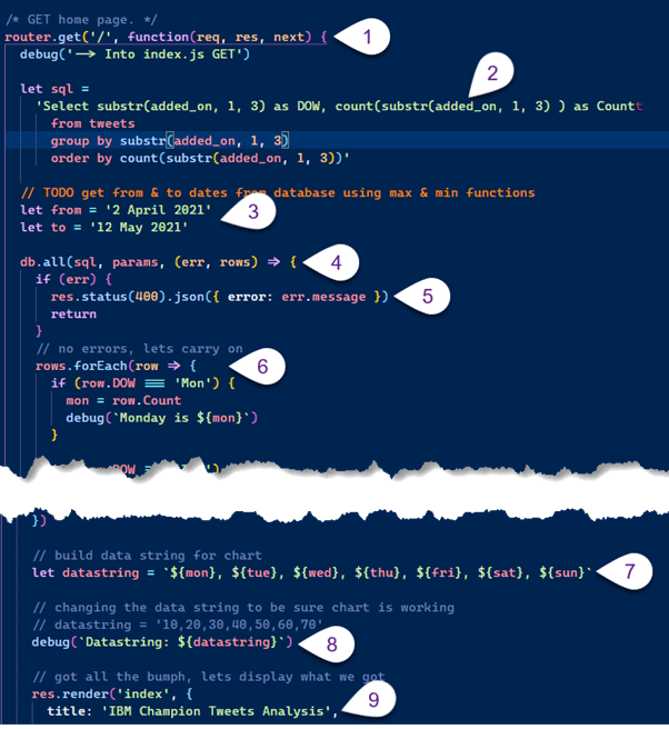 Once I had the Express framework installed, I needed to change the index.js file, in the /Routes directory. This will be used to retreive the data from our SQLite database and display our data in a chart.
