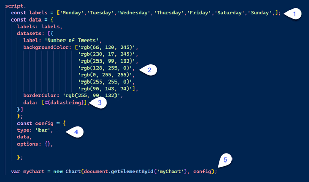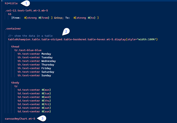 The index.pug file will receive the 7-day variables and data string from the index.js file and plug that into the chart for chart.js to display.