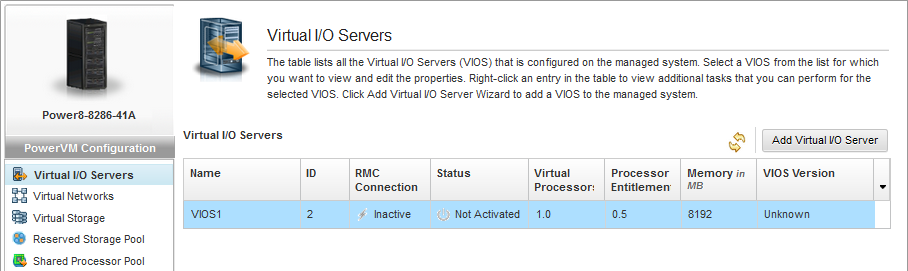 In fact, even in the Server Management view, you won’t notice much difference if you don’t use VIOS or create new LPARs. But to give you an idea of what the new style looks like, here is a screenshot of the PowerVM option.