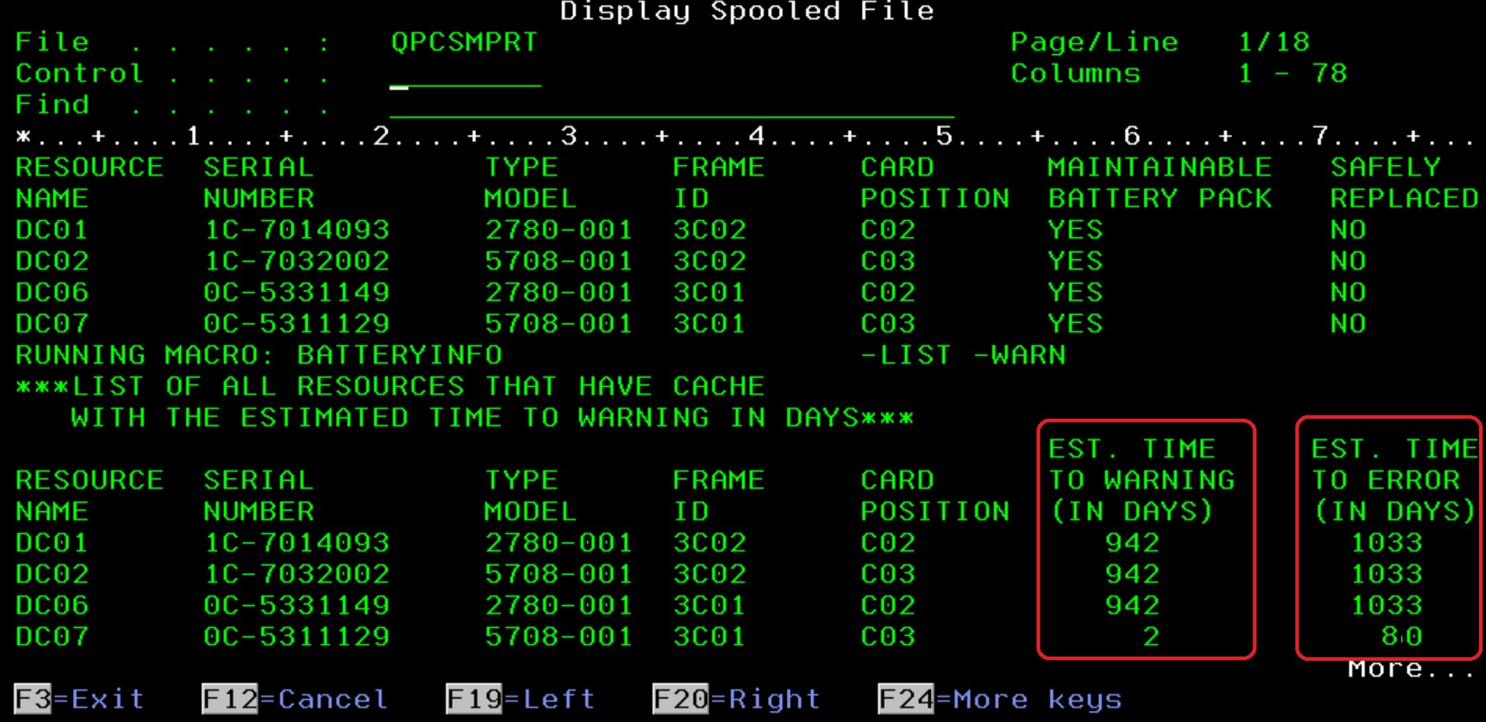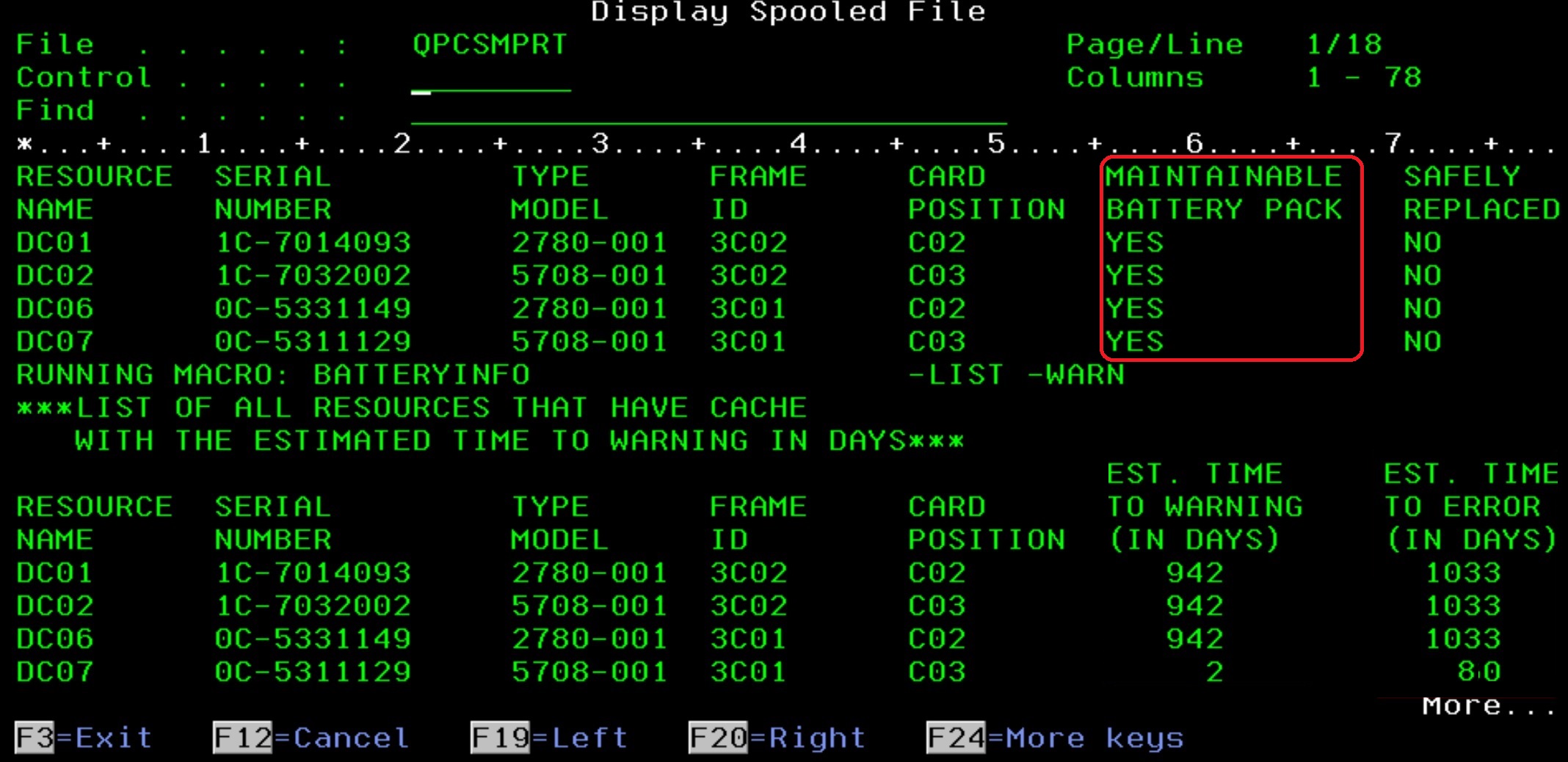 In this example we can see we have four controller cards with Cache Batteries, three of which are fine and dandy (DC01, DC02, DC06) as they all have over 1000 days to error (this is when IBM i turns them off as a precaution)