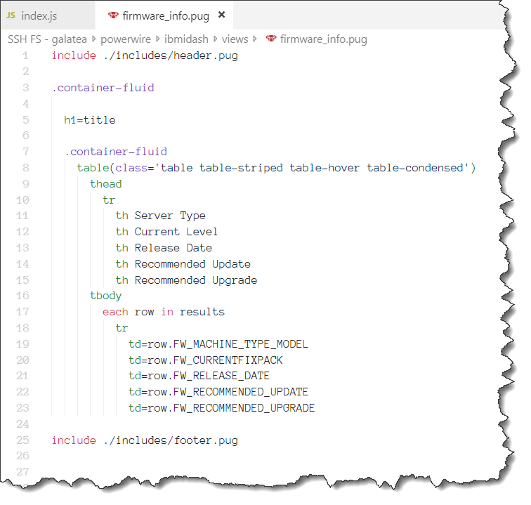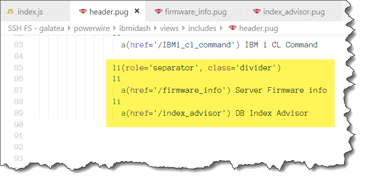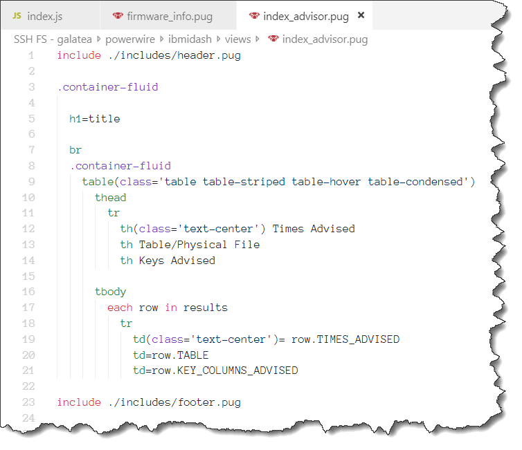 To achieve this, we need to create two new files in the /views folder. These need to be named firmware_info.pug and index_advisor.pug, as they are highlighted in the above coding.