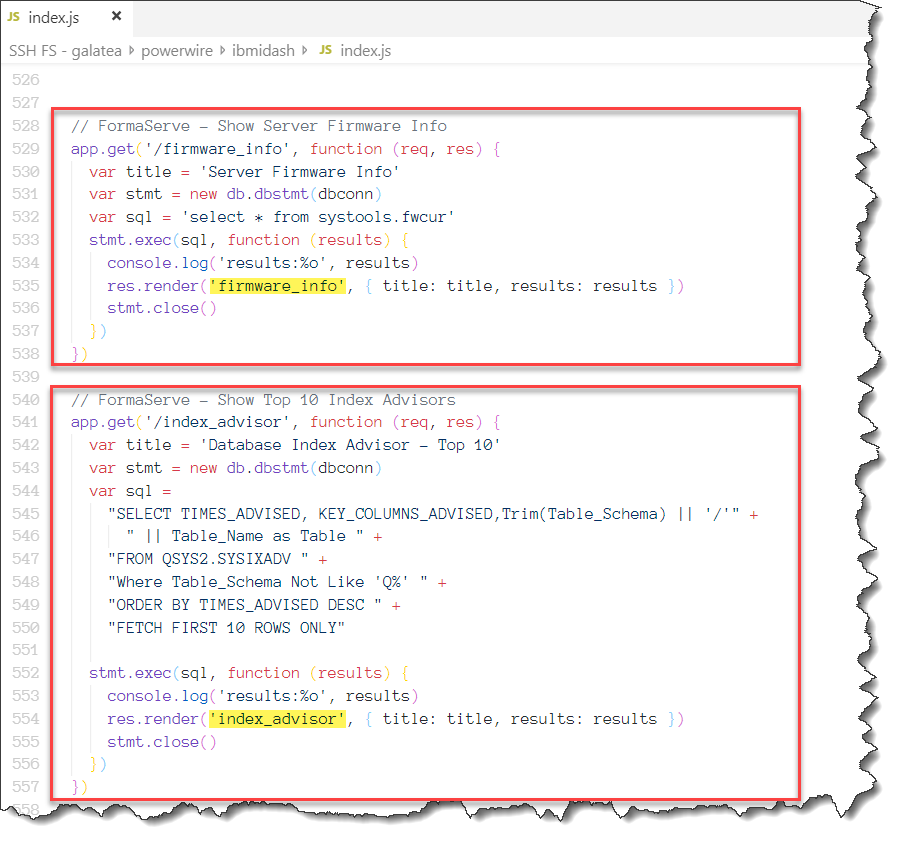 The main node page of this application is the index.js file. This has to be edited to include the above SQL statements.